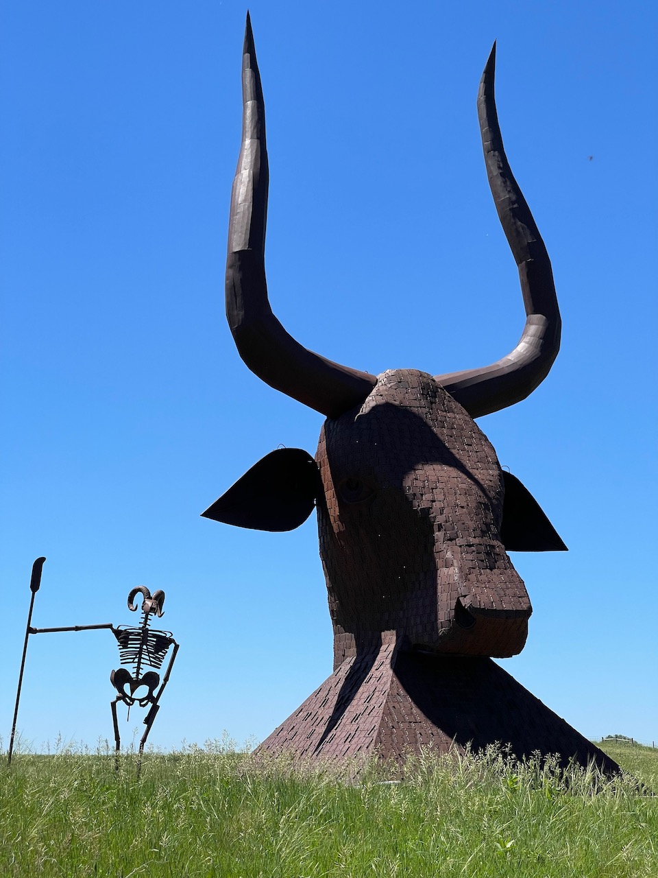 The temperature is approaching 100 degrees and we see what appears to be a sculpture of a larger than life horse and bull’s head off in the distance as we drive west on Route 90. These sculptures were visible from miles away and we were compelled to investigate. We took exit 374 for Montrose and followed signs directing us to a small gravel road that took us back into cattle fields where we found ourselves at the Porter Sculpture Park. A South Dakota gem!