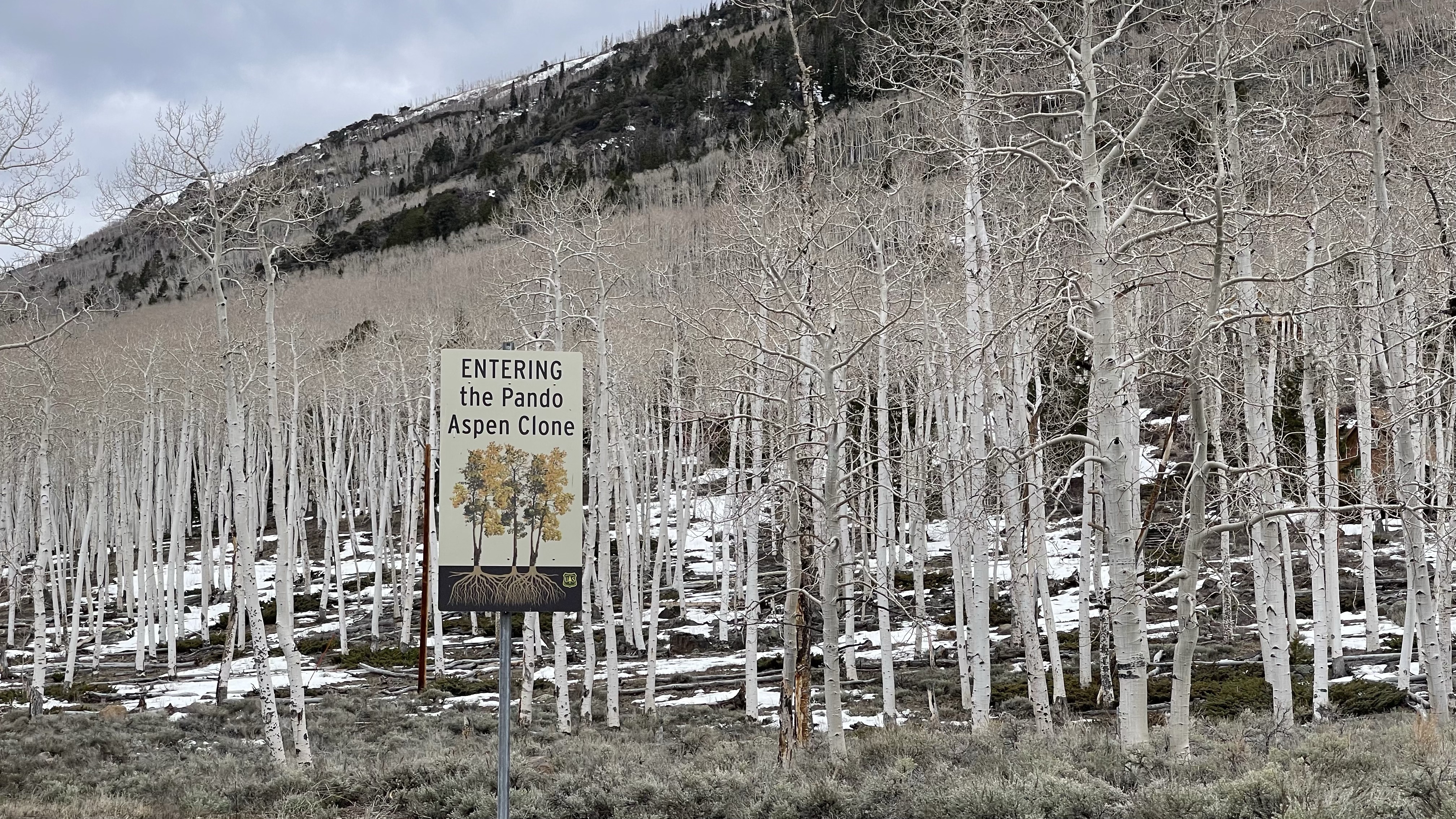On the day we were there, the Forest Service website reported road conditions for a majority of the forest roads as “May be impassable due to snow conditions”. Indeed, we witnessed a few roads that were still snow and ice covered. Fortunately, we were able to drive through to the Pando and eat lunch in the parking lot of the still closed campground located between Fish Lake and the clone. Fish Lake is a high alpine lake with an elevation of approximately 8,800 feet and it was 43 degrees on the day we visited! We were happy to eat in our rig with no one in sight.